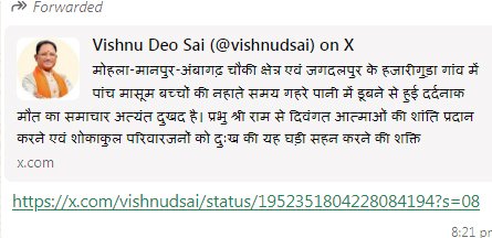 मोहला-मानपुर-अंबागढ़ चौकी क्षेत्र एवं जगदलपुर के हजारीगुड़ा गांव में पांच मासूम बच्चों की नहाते समय गहरे पानी में डूबने से हुई दर्दनाक मौत का समाचार अत्यंत दुखद है। प्रभु श्री राम से दिवंगत आत्माओं की शांति प्रदान करने एवं शोकाकुल परिवारजनों को दुःख की यह घड़ी सहन करने की शक्ति प्रदान करने की प्रार्थना करता हूं। इस संदर्भ में जिला प्रशासन से पीड़ित परिवारों को शासन के नियमानुसार चार-चार लाख रुपए आर्थिक सहायता राशि देने के निर्देश दे दिए गए हैं। बारिश के इस मौसम में तेज प्रवाह वाले नदी-नालों एवं गहरे जल स्रोतों से दूरी बनाए रखने की आम जनता से अपील करता हूँ।