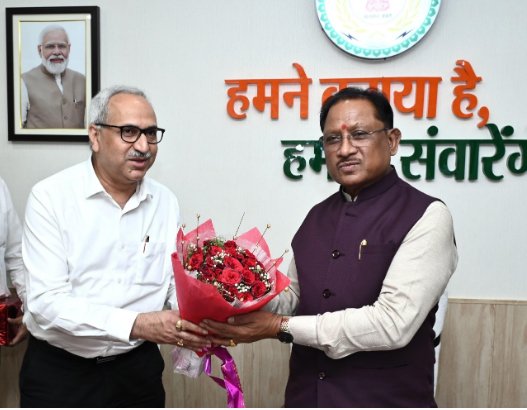रायपुर / मुख्यमंत्री श्री विष्णु देव साय से आज राजधानी रायपुर स्थित मुख्यमंत्री निवास कार्यालय में भिलाई स्टील प्लांट के नवनियुक्त निदेशक श्री चित्त रंजन महापात्र ने सौजन्य मुलाकात की। इस अवसर पर श्री महापात्र ने मुख्यमंत्री श्री साय को पुष्पगुच्छ, शॉल और श्रीफल भेंट कर सम्मानित किया। मुख्यमंत्री ने श्री महापात्र को उनकी नवीन पदस्थापना पर हार्दिक बधाई एवं शुभकामनाएँ दीं।