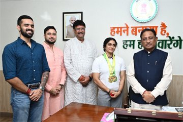 रायपुर / मुख्यमंत्री श्री विष्णुदेव साय से उनके निवास कार्यालय में एशियन अफ्रीकन पैसिफिक पावरलिफ्टिंग चैंपियनशिप की स्वर्ण पदक विजेता सुश्री नमी राय पारेख ने मुलाकात की। मुख्यमंत्री श्री साय को रायपुर निवासी सुश्री नमी राय पारेख ने बताया कि 05 से 13 जुलाई तक जापान के हिमेजी में एशियन पॉवरलिफ्टिंग एसोसिएशन द्वारा एशियन अफ्रीकन पैसिफिक पावरलिफ्टिंग चैंपियनशिप का आयोजन किया गया था। इस चैंपियनशिप में उन्होंने 57 किलोग्राम डेडलिफ्ट वर्ग में स्वर्ण पदक हासिल किया है।