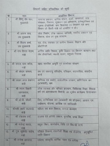 मुख्यमंत्री श्री साय ने सभी मंत्रियों के उज्ज्वल कार्यकाल की मंगलकामना करते हुए कहा कि राज्य सरकार सामूहिक सहयोग और प्रतिबद्धता के बल पर जनता की आकांक्षाओं की पूर्ति के लिए निरंतर प्रयासरत रहेगी।