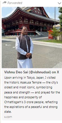 रायपुर – छत्तीसगढ़ के मुख्यमंत्री श्री विष्णुदेव साय ने जापान पहुंचने के बाद सबसे पहले जापान की राजधानी टोक्यो में स्थित ऐतिहासिक असाकुसा मंदिर के दर्शन किए। टोक्यो का यह सबसे प्राचीन और प्रतिष्ठित मंदिर शांति और सामर्थ्य का प्रतीक माना जाता है। मुख्यमंत्री श्री साय ने मंदिर में पूजा-अर्चना कर छत्तीसगढ़ की 3 करोड़ जनता की खुशहाली, समृद्धि और निरंतर प्रगति की कामना की। उन्होंने कहा कि यह मंदिर मानवता को शांति और शक्ति का संदेश देता है और यही भाव छत्तीसगढ़ की जनता की आकांक्षाओं में भी झलकता है।
