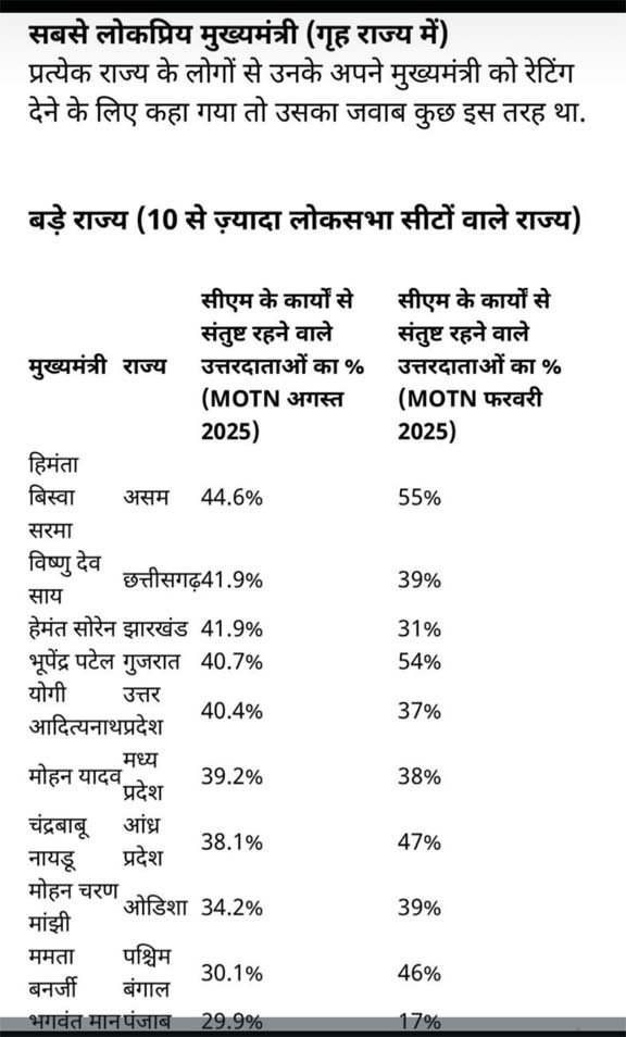 बड़े राज्यों के संदर्भ में प्रदर्शन: बड़े राज्यों के समूह में साय का 41.9% अंक दूसरे स्थान की पुष्टि करता है — इससे पता चलता है कि गृह राज्य में उनकी स्वीकार्यता कई अन्य बड़े राज्यों के मुख्यमंत्रियों के बराबर-ऊपर है।