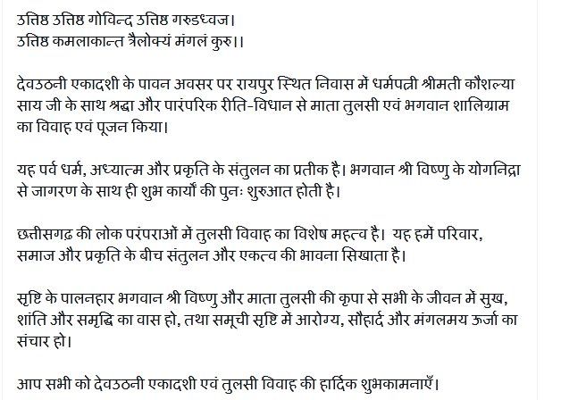 मुख्यमंत्री श्री साय ने इस अवसर पर कहा कि देवउठनी एकादशी धर्म, अध्यात्म और प्रकृति के संतुलन का प्रतीक है। भगवान श्री विष्णु के योगनिद्रा से जागरण के साथ ही शुभ कार्यों की पुनः शुरुआत होती है। तुलसी विवाह समाज में पवित्रता, सौहार्द और एकत्व की भावना को जागृत करता है।