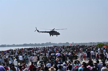 “सूर्यकिरण” टीम ने अनुशासन, परस्पर विश्वास, सटीकता और उत्साह के साथ एक घंटे तक वायु सेना के विमानों के साथ कलाबाजी दिखाकर दर्शकों का भरपूर मनोरंजन किया। नवा रायपुर के सेंध जलाशय में मौजूद हजारों दर्शक पायलटों के हैरतअंगेज साहस और करतबों को देखकर मंत्रमुग्ध होते रहे। विंग कमांडर श्री ए.व्ही. सिंह के नेतृत्व में वन-एफ-9 और वन-एफ-8 हेलीकॉप्टर यूनिट ने वी-17 और वी-5 हेलीकॉप्टरों से स्लीपरी और स्काई-ऑपरेशन के करतब दिखाए। ‘आदिदेव’ नाम के इन हेलीकॉप्टरों से केवल 15 मीटर ऊंचाई पर स्थिर रहकर 14 गरूड़ कमांडोज रस्सी के सहारे नीचे उतरे। वहीं स्काई-ऑपरेशन के दौरान आठ गरूड़ कमांडोज रस्सी पर लटककर हेलीकॉप्टर से दर्शकों के सामने से आकाश में उड़ते हुए गुजरे। इन दोनों ऑपरेशनों को लड़ाई और आपदा के दौरान जनसामान्य को बचाने के लिए किया जाता है।
