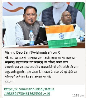 मुख्यमंत्री श्री साय ‘वंदे मातरम्’ की 150वीं वर्षगांठ पर नई दिल्ली में आयोजित स्मरणोत्सव में वर्चुअली शामिल हुए और प्रधानमंत्री का उद्बोधन भी सुना।