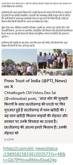मुख्यमंत्री ने कहा कि छत्तीसगढ़ की समृद्धि का यह सफर आज फिर एक नई उम्मीद और किसानों के अटूट विश्वास की रोशनी के साथ आगे बढ़ रहा है।