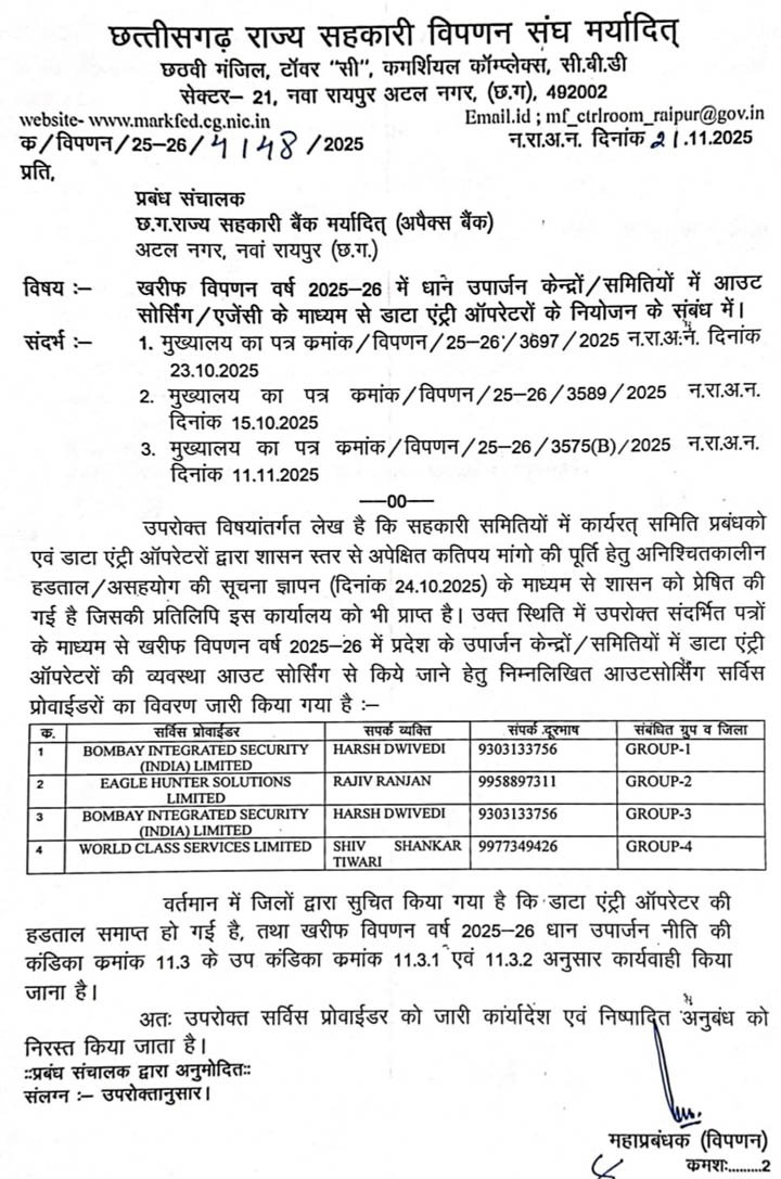 रायपुर/बिलासपुर : छत्तीसगढ़ राज्य सहकारी विपणन संघ मर्यादित (मार्कफेड) ने एक निर्णायक कदम उठाते हुए खरीफ विपणन वर्ष 2025-26 के लिए धान उपार्जन केंद्रों/समितियों में डाटा एंट्री ऑपरेटरों (DEO) के आउटसोर्सिंग (Outsourcing) से नियोजन पर तत्काल प्रभाव से रोक लगा दी है।