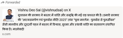 मुख्यमंत्री ने इसे राज्य की प्रभावी रणनीति, पुलिस प्रशासन की सतत मेहनत और जनविश्वास का सामूहिक परिणाम बताते हुए बस्तर में स्थायी शांति स्थापना की दिशा में इसे एक महत्वपूर्ण उपलब्धि कहा।