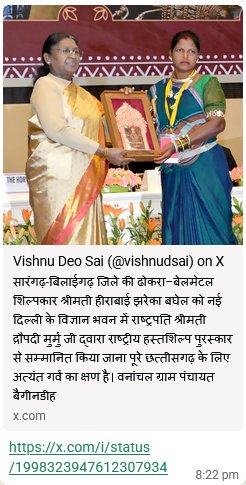 मुख्यमंत्री श्री साय ने कहा कि ग्राम पंचायत बैगीनडीह जैसे वनांचल क्षेत्र से निकलकर अपनी विशिष्ट शिल्पकला के माध्यम से देशभर में छत्तीसगढ़ की पहचान को नई ऊँचाइयाँ देने वाली श्रीमती बघेल की उपलब्धि हमारे प्रदेश की समृद्ध लोककला, परंपरा और ग्रामीण प्रतिभा की अद्भुत चमक को राष्ट्रीय मंच पर पुनर्स्थापित करती है। ढोकरा कला सदियों पुरानी धरोहर है, और श्रीमती बघेल जैसी शिल्प कलाकार इन परंपराओं को आधुनिक समय के अनुरूप जीवंत बनाए रखने का कार्य कर रही हैं।
