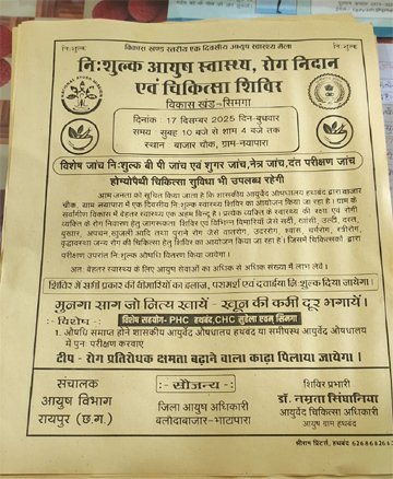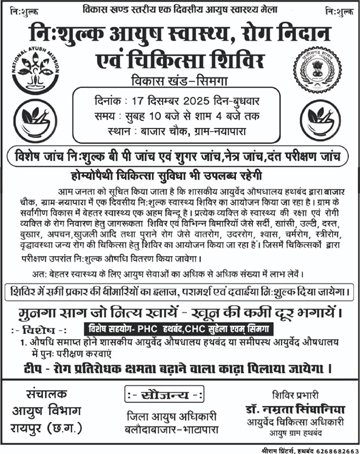 बलौदाबाजार। संचालक आयुष विभाग रायपुरऔर जिला आयुष अधिकारी बलौदा बाजार के कुशल मार्गदर्शन में दिनांक 17 /12/2025 को सिमगा विकास खंड के द्वितीय विकास खंड स्तरीय निःशुल्क आयुष स्वास्थ्य मेला और जनजाग रुकता शिविर का आयोजन बाजार चौक ग्राम नयापारा में किया गया।शिविर का शुभारंभ सिमगा जनपद अध्यक्ष श्री दौलत पाल जी एवं नयापारा सरपंच श्री डोमार मार्कण्डेय जी एवं पूर्व सरपंच श्री भुनेश्वर वर्मा जी के द्वारा भगवान धन्वंतरि के पूजन के साथ किया गया। 471 लोगों ने स्वास्थ्य शिविर में आयुर्वेद चिकित्सा का लाभ लिया।140 लोगों का शुगर एवं बी पी जांच किया गया। 100 लोगों का नेत्र जांच किया गया।56 लोगों का दंत जांच किया गया।