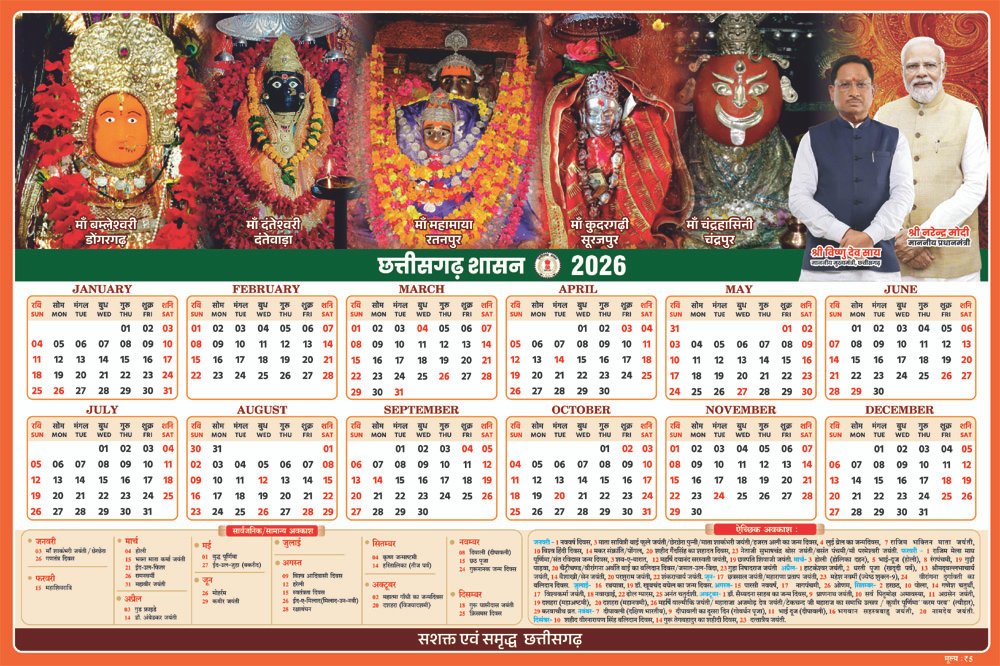 कैलेंडर के मुख्य पृष्ठ पर छत्तीसगढ़ के पाँच प्रमुख शक्तिपीठ — मां बमलेश्वरी डोंगरगढ़, मां महामाया रतनपुर, मां दंतेश्वरी दंतेवाड़ा, मां चंद्रहासिनी चंद्रपुर और मां कुदरगढ़ी सूरजपुर के पावन धाम को प्रमुखता से स्थान दिया गया है। साथ ही प्रधानमंत्री श्री नरेंद्र मोदी एवं मुख्यमंत्री श्री विष्णु देव साय के छायाचित्र भी अंकित हैं। पृष्ठभूमि में सिरपुर एवं राजिम के मंदिर, आदिवासी संस्कृति, मधेश्वर पहाड़ तथा चित्रकोट जलप्रपात के आकर्षक ग्राफिकल प्रतिरूप सम्मिलित किए गए हैं, जो छत्तीसगढ़ की समृद्ध सांस्कृतिक एवं प्राकृतिक धरोहर का प्रतीक हैं।