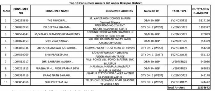 रायपुर., छत्तीसगढ़ स्टेट पॉवर डिस्ट्रीब्यूसन कंपनी लिमिटेड ने बड़े बकाया बिजली बिल वाले उपभोक्ताओं की सूची जारी की है। इस सूची में सबसे ऊपर सेंट जेवियर स्कूल, गनियारी है, जिसका बकाया 52 लाख 14 हजार 166 रुपये है। कंपनी ने अब बकाए बिल वसूलने और डिस्कनेक्शन के लिए विशेष अभियान चलाने का निर्णय लिया है। कंपनी ने बताया कि 1 लाख रुपये से अधिक बकाया रखने वाले उपभोक्ताओं को चिन्हित किया गया है। जिनके बिल लंबे समय से बकाया हैं, उनकी बिजली पहले काटी जाएगी, और जिनके कनेक्शन पहले से कटे हैं, उन्हें कानूनी नोटिस जारी किए जाएंगे। बिलासपुर विद्युत क्षेत्र के कार्यपालक निदेशक ए.के. अम्बस्ट ने उपभोक्ताओं से अपील की कि लंबित बिजली बिल तुरंत चुकाएं, ताकि उनकी बिजली आपूर्ति बाधित न हो। उन्होंने कहा कि भुगतान न करने वाले क्षेत्रों में सख्त कार्रवाई की जाएगी और इस अभियान की नियमित समीक्षा भी की जाएगी। जारी लिस्ट में इस सूची में सबसे ऊपर सेंट जेवियर हाई स्कूल, भर्नी, गनियारी, बिलासपुर है, जिसका बकाया 52 लाख 14 हजार 166 रुपये है। सूची में अन्य बड़े बकायेदारों में रिंग रोड नंबर-2, शांति नगर, बिलासपुर, स्वर्ण चेंबर, हाई कोर्ट के सामने, अभिषेक अग्रवाल, प्रवीण जैन, सौरभ कौशिक, प्रभा साहू, पारस नाथ बैरागी, प्रीतम लाल आदि शामिल हैं। इन 10 बकायेदारों का कुल बकाया 1 करोड़ 19 लाख 38 हजार 642 रुपये बताया गया है।