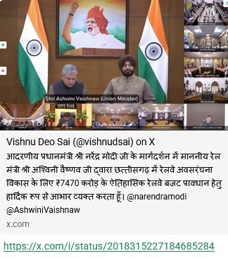 रायपुर /छत्तीसगढ़ में रेलवे अधोसंरचना विकास के लिए ₹7,470 करोड़ के ऐतिहासिक बजट प्रावधान किए जाने पर मुख्यमंत्री श्री विष्णु देव साय ने प्रधानमंत्री श्री नरेंद्र मोदी और रेल मंत्री श्री अश्विनी वैष्णव के प्रति हार्दिक आभार व्यक्त किया है।