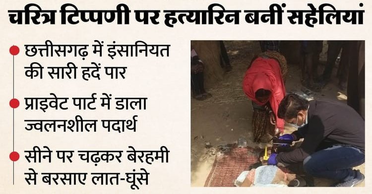 पुलिस के मुताबिक, सुगतिन नेताम (36 वर्ष) और ईतवारिन बाई (46 वर्ष) का कहना था कि सुमित्रा नेताम (37) गांव में उनके बारे में अपमानजनक बातें फैला रही थी। इसी रंजिश में दोनों आरोपी सुमित्रा के घर पहुंचीं। वहां पहले उसे बुरी तरह प्रताड़ित किया गया। गुप्तांग में लाल मिर्च और अन्य ज्वलनशील पदार्थ डालकर उसे तड़पाया गया। इसके बाद आरोपियों ने उसके सीने पर चढ़कर डंडों, लात-घूंसों से तब तक हमला किया, जब तक उसकी मौत नहीं हो गई।