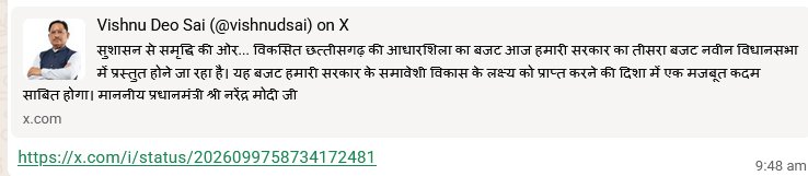 मुख्यमंत्री श्री साय ने प्रदेशवासियों को आगामी बजट के लिए अपनी शुभकामनाएं देते हुए कहा कि यह बजट छत्तीसगढ़ के उज्ज्वल भविष्य की मजबूत आधारशिला साबित होगा।