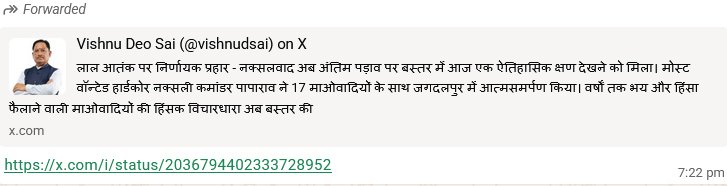 मुख्यमंत्री श्री विष्णु देव साय ने इस आत्मसमर्पण को नक्सलवाद के खिलाफ निर्णायक प्रहार बताते हुए कहा कि नक्सलवाद अब अपने अंतिम पड़ाव पर है और बस्तर की धरती पर हिंसा की विचारधारा पराजित होती स्पष्ट दिखाई दे रही है। उन्होंने कहा कि वर्षों तक भय और हिंसा का वातावरण बनाने वाली माओवादी विचारधारा अब समाप्ति की ओर है और बस्तर तेजी से विकास की मुख्यधारा से जुड़ रहा है।