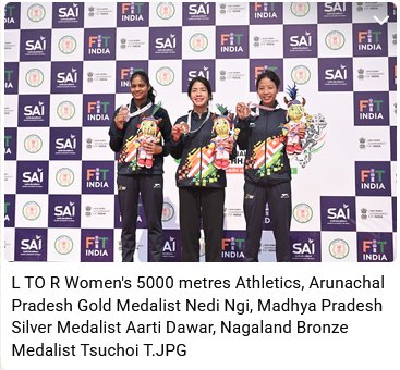 5000 मीटर: स्वर्ण – नेडी न्गी (अरुणाचल प्रदेश) 18:24.66 सेकंड; रजत – आरती दावर (मध्य प्रदेश) 18:29.28 सेकंड; कांस्य – त्सुचोई टी (नागालैंड) 18:35.60 सेकंड