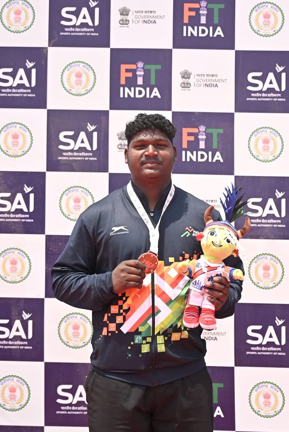 शॉट पुट: स्वर्ण – सिद्धार्थ नागेश (छत्तीसगढ़) 13.52 मीटर; रजत – दानिश मकवाना (गुजरात) 13.04 मीटर; कांस्य – मानस प्रतिम राभा (असम) 12.20 मीटर