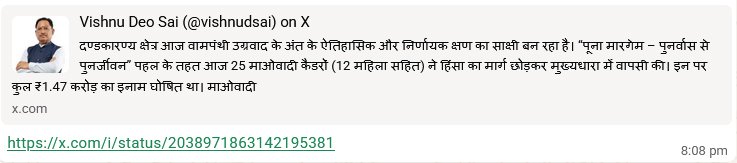 मुख्यमंत्री ने कहा कि आत्मसमर्पण करने वाले इन 25 माओवादी कैडरों पर कुल ₹1.47 करोड़ का इनाम घोषित था। इनका मुख्यधारा में लौटना इस बात का प्रमाण है कि अब भटके हुए लोगों का भरोसा लोकतांत्रिक व्यवस्था और सरकार की पुनर्वास नीति पर मजबूत हुआ है।