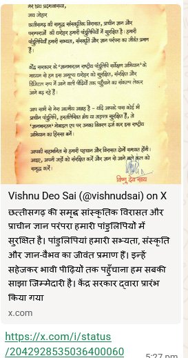 मुख्यमंत्री श्री साय ने कहा कि केंद्र सरकार द्वारा प्रारंभ किया गया ‘ज्ञानभारतम राष्ट्रीय पांडुलिपि सर्वेक्षण अभियान’ इस दिशा में एक दूरदर्शी और महत्वपूर्ण पहल है। यह अभियान देशभर में उपलब्ध प्राचीन पांडुलिपियों का सर्वेक्षण कर उन्हें सुरक्षित, संरक्षित और डिजिटल माध्यम से सुलभ बनाने का कार्य कर रहा है।