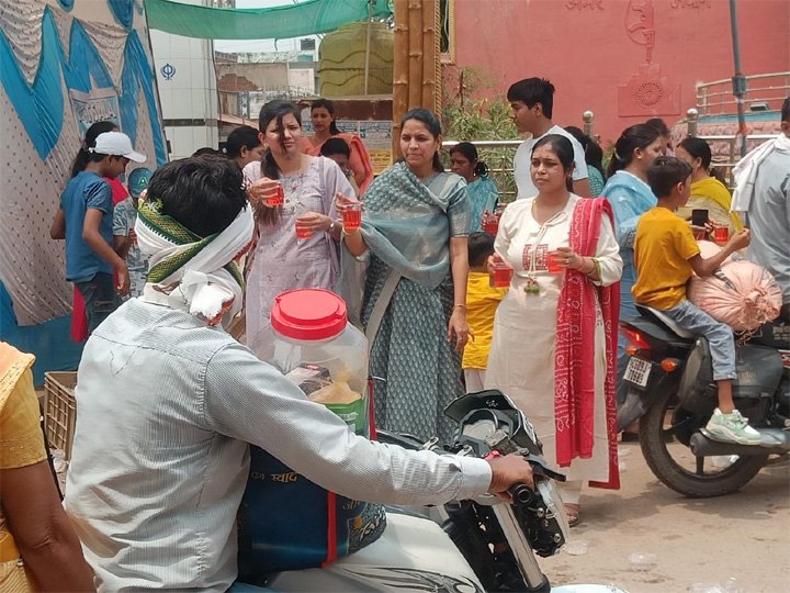 थान खमरिया। अक्षय तृतीया के पावन अवसर पर अग्रवाल महिला मंडल द्वारा भीषण गर्मी के बीच भारत माता चौक में शरबत एवं लस्सी का वितरण किया गया। इस सेवा कार्य के अंतर्गत हजारों राहगीरों को शीतल पेय पिलाकर गर्मी से राहत पहुंचाई गई।