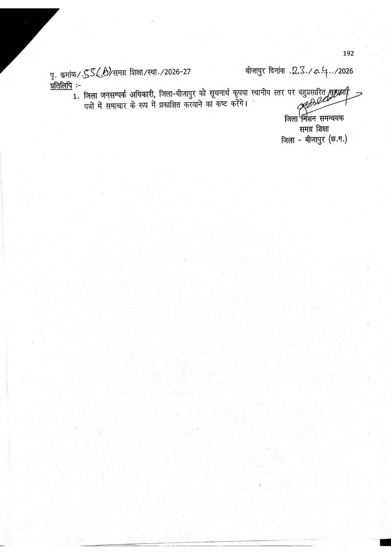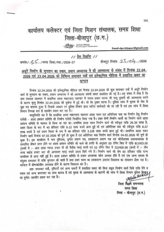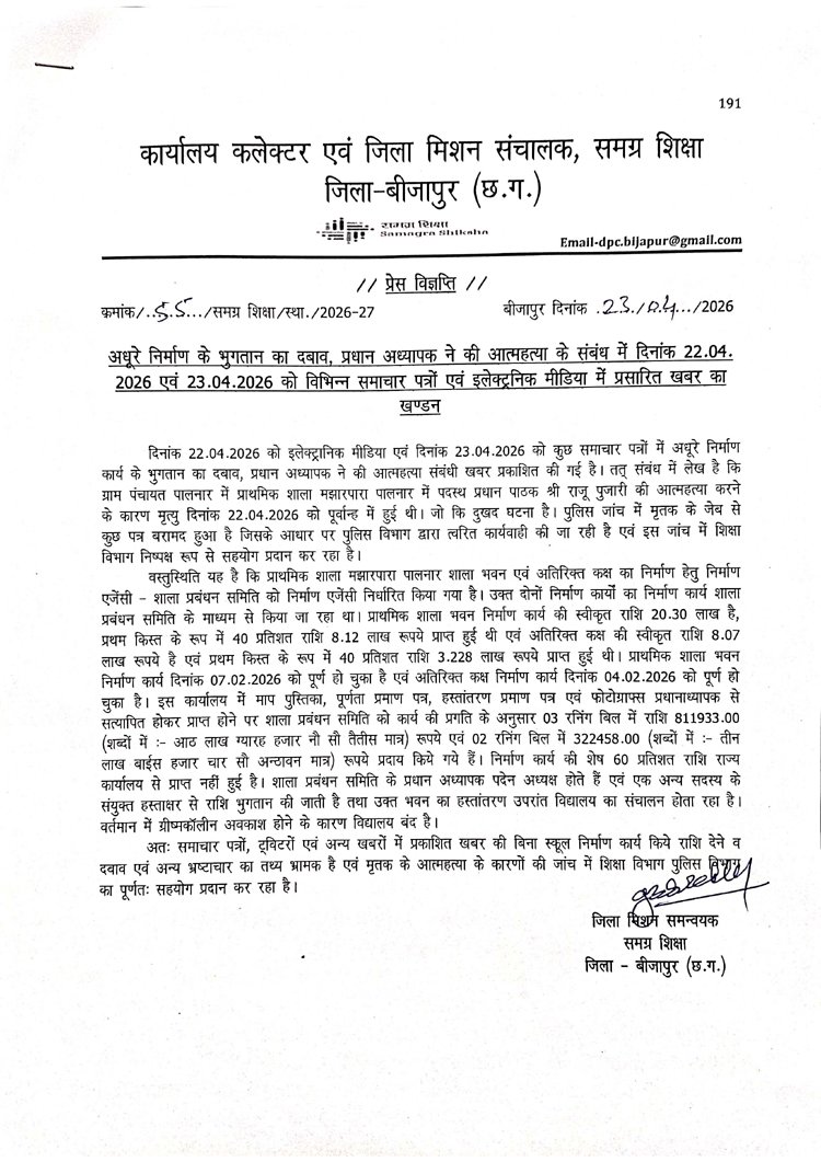 रायपुर । बीजापुर जिले में प्रधान अध्यापक की आत्महत्या से जुड़ी हालिया मीडिया रिपोर्ट्स को लेकर जिला मिशन समन्वयक समग्र शिक्षा बीजापुर ने स्थिति स्पष्ट करते हुए कहा है कि अधूरे निर्माण कार्य के भुगतान के दबाव जैसी खबरें तथ्यहीन एवं भ्रामक हैं। जिला मिशन समन्वयक, समग्र शिक्षा बीजापुर द्वारा जारी स्पष्टीकरण में कहा गया है कि मामले की संवेदनशीलता को देखते हुए विभाग निष्पक्ष रूप से पुलिस जांच में पूर्ण सहयोग कर रहा है।