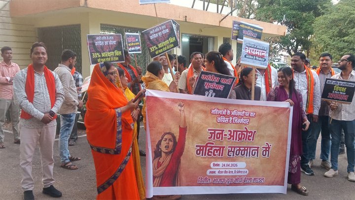 थान खमरिया। बेमेतरा जिले के बेरला में भारतीय जनता युवा मोर्चा (भाजयुमो) द्वारा कांग्रेस एवं अन्य विपक्षी दलों के खिलाफ जोरदार विरोध प्रदर्शन किया गया। यह प्रदर्शन महिला आरक्षण बिल के विरोध में विपक्ष के रुख के खिलाफ आयोजित किया गया।