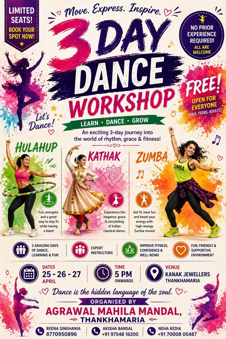 थानखम्हरिया। नगर में सांस्कृतिक एवं फिटनेस गतिविधियों को प्रोत्साहित करने के उद्देश्य से अग्रवाल महिला मंडल, थानखम्हरिया द्वारा 3 दिवसीय डांस वर्कशॉप का आयोजन किया जा रहा है। यह वर्कशॉप 25, 26 एवं 27 अप्रैल को आयोजित होगी, जिसमें बच्चों, युवाओं एवं वयस्कों सहित सभी आयु वर्ग के लोग भाग ले सकेंगे।