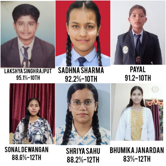 विद्यालय के प्रभारी प्राचार्य श्री मनीष चौबे के नेतृत्व में यह उपलब्धि हासिल हुई। कक्षा दसवीं के कक्षा शिक्षक श्री प्रसन्न जायसवाल एवं समस्त शिक्षकों के मार्गदर्शन में विद्यार्थियों ने उत्कृष्ट प्रदर्शन किया। कक्षा दसवीं में लक्ष्य सिंह राजपूत ने 95.1 प्रतिशत अंक प्राप्त कर प्रथम स्थान हासिल किया। साधना शर्मा 92.2 प्रतिशत के साथ द्वितीय एवं पायल साहु 91.2 प्रतिशत के साथ तृतीय स्थान पर रहीं। दसवीं कक्षा में 33 विद्यार्थी प्रथम श्रेणी एवं 7 विद्यार्थी द्वितीय श्रेणी में उत्तीर्ण हुए।
