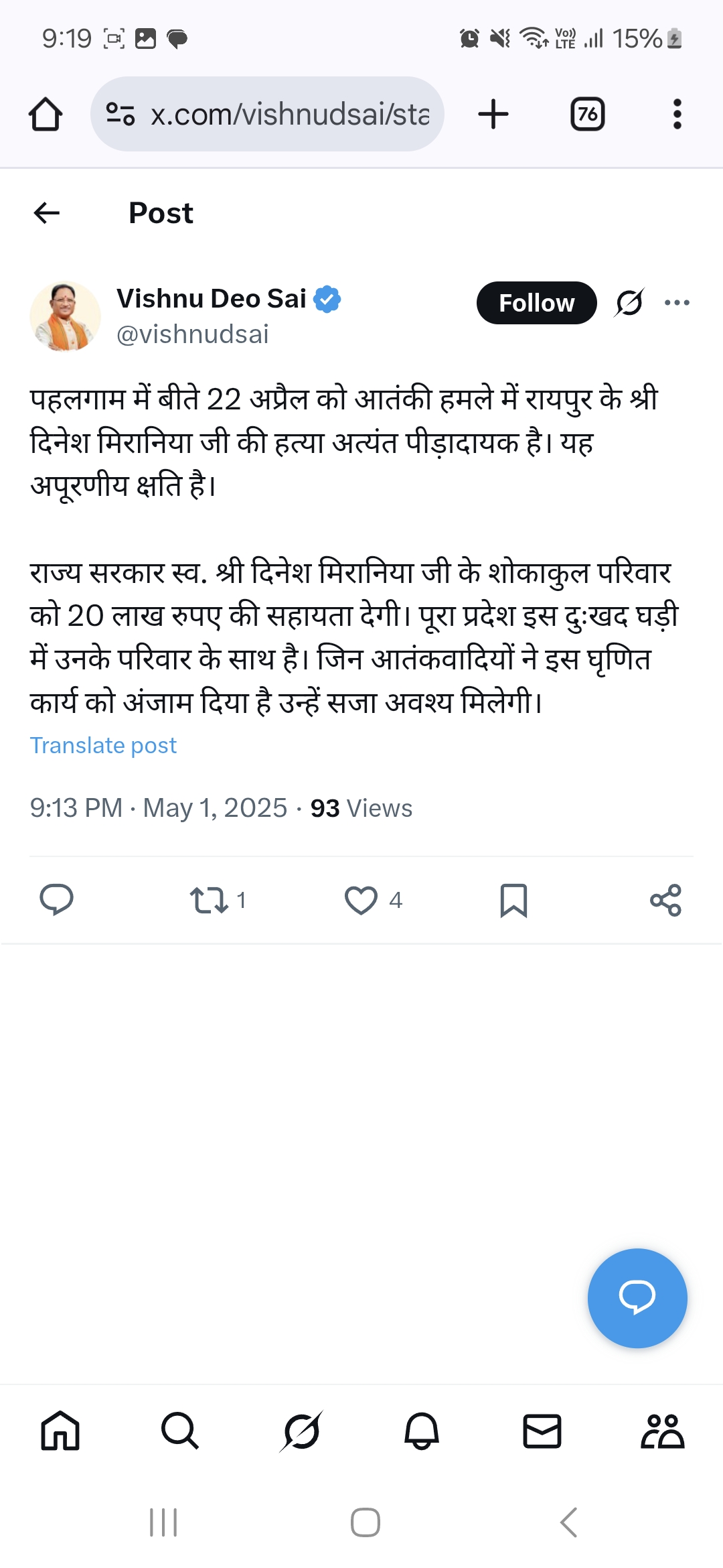 मुख्यमंत्री विष्णु देव ने सोशल मीडिया पर लिखा