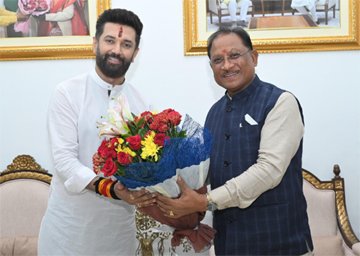 रायपुर /मुख्यमंत्री श्री विष्णु देव साय से आज मुख्यमंत्री निवास कार्यालय में केन्द्रीय खाद्य प्रसंस्करण उद्योग मंत्री श्री चिराग पासवान ने सौजन्य मुलाकात की। इस दौरान श्री साय ने श्री पासवान को कोसा वस्त्र एवं बेल मेटल से बने स्मृति चिन्ह भेंटकर आत्मीय स्वागत किया। गौरतलब है कि केन्द्रीय खाद्य प्रसंस्करण उद्योग मंत्री श्री चिराग पासवान आज एक दिवसीय प्रवास पर छत्तीसगढ़ पहुंचे थे।