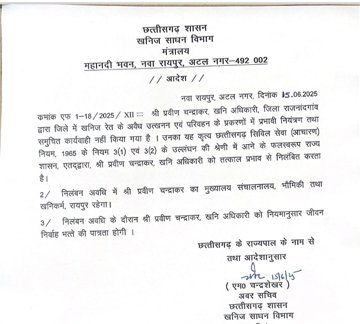 राजनांदगांव में अवैध रेत उत्खनन और गोलीकांड मामले में बड़ी कार्रवाई हुई है। खनिज अधिकारी राजनांदगांव प्रवीण चंद्राकर को निलंबित किया गया है। छत्तीसगढ़ शासन खनिज साधन विभाग मंत्रालय महानदी भवन नया रायपुर अटल नगर के द्वारा एक आदेश जारी किया गया है,जिसमें तत्काल प्रभाव से खनिज अधिकारी को निलंबित किया गया है।