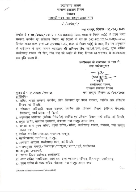 छत्तीसगढ़ शासन के सामान्य प्रशासन विभाग ने एक आदेश जारी कर श्री अमिताभ जैन जिनका आज रिटायरमेंट का दिन था उन्हें 3 महीने का एक्सटेंशन प्रदान किया गया है। तदानुसार आदेश पत्र आज जारी किया गया:-
